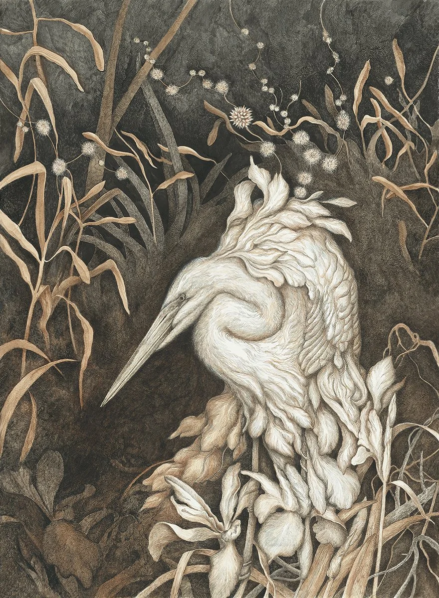 Detail of a new work: walnut and black inks, gouache, acrylic, and silver leaf on paper.